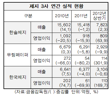 무림페이퍼도 2010년과 2011년 영업이익이 66%, 80.2%나 감소했으나 올 상반기에는 300%가 넘는 성장세를 보였다.