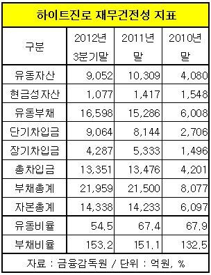 하이트진로는 작년 인수합병 과정에서 총차입금이 1조3천476억원까지 늘어나 부채비율이 2010년 132.5%에서 지난해 말 151.1%로 크게 높아졌고, 올 3분기에도 소폭 상승한 상태다.