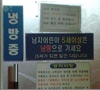 공개된 사진 속 경고문은 여탕에 남자 아이를 데리고 오지 말라는 내용을 센스 있게 표현한 것으로 '5세가 되면 알 건 다 압니다'라고 적혀있다.