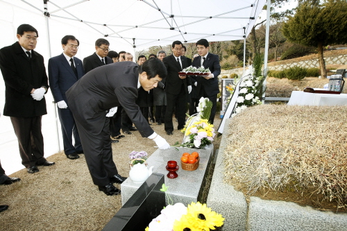 이날 추모식에는 조준희 기업은행장을 비롯해 자회사 사장단과 기업은행 임직원 등 30여명이 참석했다. 애초 추모일은 11월 30일이지만 은행 일정상 올해는 이틀 앞당겨 진행됐다. 초겨울 쌀쌀한 날씨 속에 열린 추모식은 조 행장의 헌화를 시작으로 참석자들이 차례차례 헌화와 헌주, 묵념하는 순서로 치러졌다.