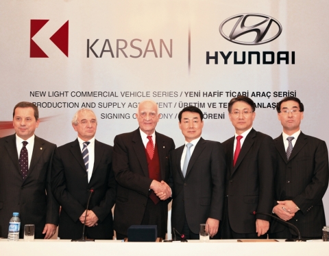 현대자동차(회장 정몽구)는 터키 이스탄불에서 현대차 상용수출사업부장 정영훈 부사장과 터키 상용차 제조업체 카르산의 이난 키라치 회장 등 양사 관계자가 참석한 가운데 유럽 전략형 소형 상용차 생산계약을 체결했다고 29일 밝혔다.