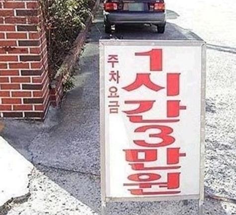 공개된 사진에는 주차금지 대신 '주차요금 1시간 3만원'이라는 입간판을 세워놓아 눈길을 끈다.