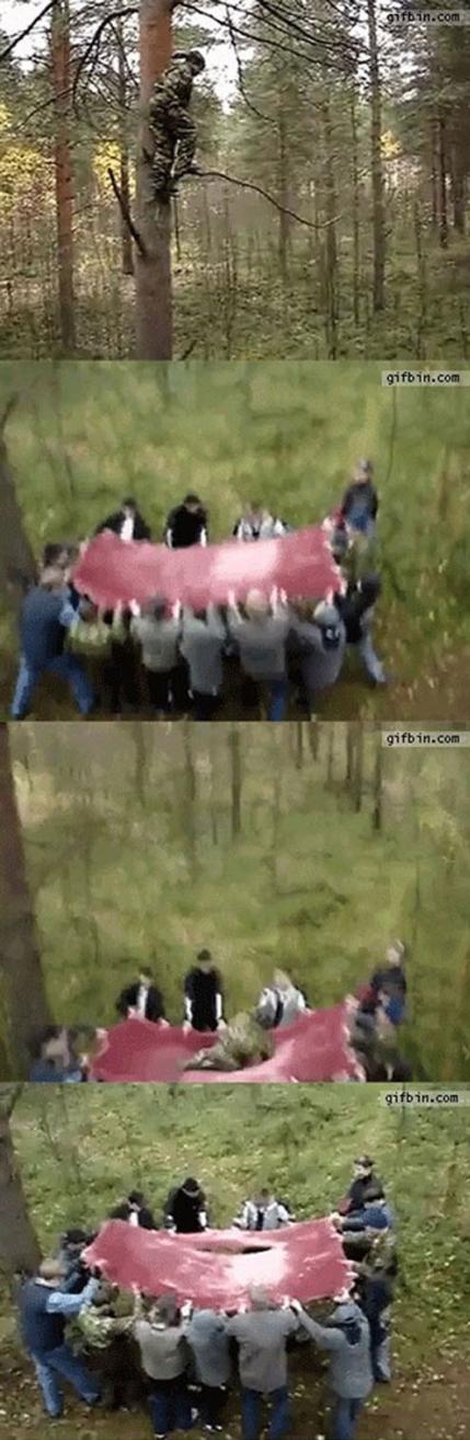 남자가 나무에서 뛰어내리고 그 순간 담요는 그를 지켜주지 못하고 찢어져버렸다. 얇은 담요가 남자의 무게를 견디지 못했던 것.