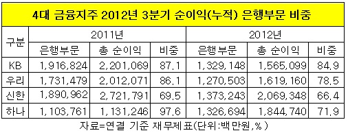 실제로 연결 재무제표를 기준으로 KB금융은 올 3분기 순이익(누적)에서 은행 비중이 84.9%로 4대 금융지주 가운데 가장 크다.