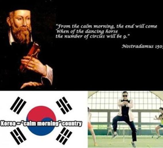 최근 해외 온라인 사이트에는 노스트라다무스가 2012년 12월 지구종말을 예언하며 "춤추는 말의 숫자의 원이 9개가 되는 때 고요한 아침으로부터 종말이 올 것이다(From the calm morning, the end will come when of the dancing horse the number of circles will be 9)"이라고 말한 사실과 싸이의 '강남스타일'과의 관계를 밝히는 글이 올라왔다.