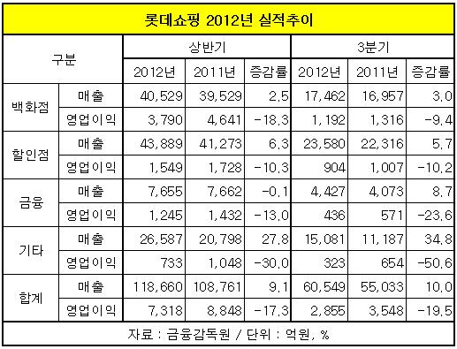실제로 롯데쇼핑의 영업이익률은 지난해말 7.5%에서 올 상반기 6.2%, 3분기 4.7%로 하락일로에 있다.