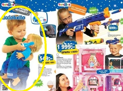 이 업체가 제작한 광고에서는 한 남자 어린이가 인형을 품에 안고 놀이를 하고 있으며 한 여자 아이는 커다란 장난감 총을 손에 들고 있는 모습을 연출한다.