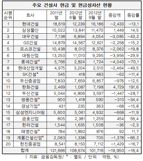 3일 금융감독원에 따르면 현대건설과 삼성물산, 대우건설을 비롯한 시평 순위 20대 건설사가 보유한 현금 및 현금성 자산은 지난 9월말 현재 10조1천716억원으로 집계됐다.