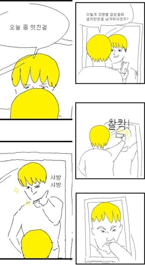 ‘셀카 찍기 전후’ 내용은 한 남성이 거울에 비친 자신의 모습을 보다 조명이 마음에 들어 셀카를 찍기 시작한다.