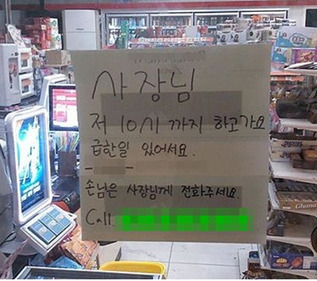 이 메모에는 급한 일이 있어서 10시까지 근무하고 퇴근한다고 '손님은 사장님께 전화주세요'라며 알바생이 사장님 번호를 적어놨다.