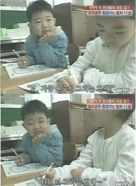 게시물은 한 방송 프로그램을 캡처한 것으로 사진에서 한 친구는 그림을 그리고 있는 친구에게 "너 지금 원숭이 그리는 거지?"라고 묻는다.