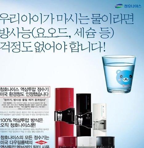 청호나이스는 지난해 4월 중앙일간지 등에 "우리 아이가 마시는 물이라면 방사능 걱정도 없어야 합니다! 청호나이스 역삼투압 정수기 미국 환경청도 인정했습니다"라는 광고를 했다.