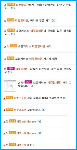 소셜커머스 5위권 업체인 ‘티켓알라딘’의 운영자 부부 동반자살로 100억원 대의 피해가 발생한데 이어 소규모 비슷한 사업 유형의 투게더, 티켓스토어 등도 페쇄 먹튀등으로 이용자들을 울리고 있다.
