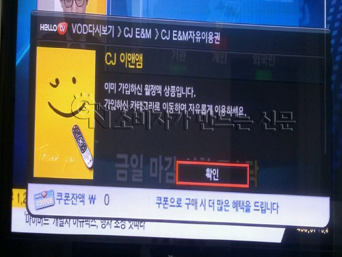 4일 경남 창원시 마산합포구에 사는 김 모(여)씨에 따르면 그는 지난 11월 이용 중인 CJ헬로비전에서 7천원 상당의 무료쿠폰을 받아 ‘CJ E&M 자유이용권’으로 교환했다.