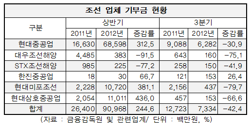 한진중공업을 제외한 6개 회사가 기부금을 줄였으며 현대중공업 외에는 대부분의 회사가 2억원도 안 되는 '소액'을 기부했다.