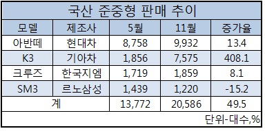 그 결과 일명 '준중형 대전'이 발생하기 전인 5월까지만해도 월 1만3천772대에 그쳤던 국내 준중형차 판매 대수는 11월 2만793대(구형 포르테 판매 포함)로 50% 가량 늘어났다.