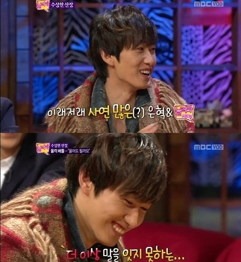 이는 최근 아이유와의 스캔들로 구설수에 오른 은혁의 시기와도 맞아 떨어진 것. 이어 '울컥배틀-울어도 될까요?'에서는 은혁은 황광희와의 배틀 중 “요즘 힘들어요”라는 한 마디로 단숨에 황광희를 제압했으며 황광희 역시 “우셔도 되겠습니다”라고 응수해 출연자들을 폭소케 만들었다.