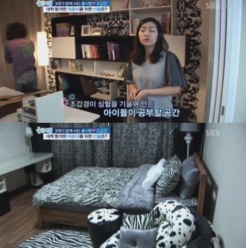 특히 아들 석준의 방에 대해 조갑경은 “가장 많이 변한 곳이 석준의 방”이라고 소개했다. 블랙과 화이트를 통해 심플한 인테리어에 얼룩말 무늬를 포인트로 세련된 느낌이 더해져 감각적인 센스가 돋보였다.