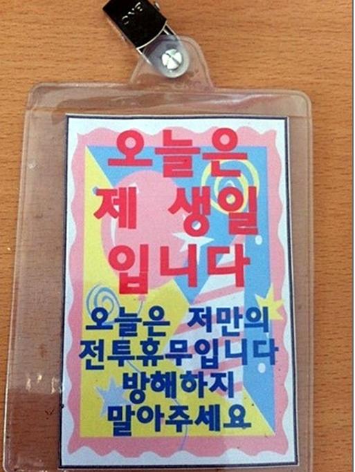 사진 속 명찰에는 "오늘은 제 생일 입니다. 오늘은 저만의 전투휴무입니다. 방해하지 말아주세요"라는 글이 적혀있다.