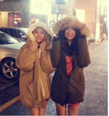 공개된 사진에서 박규리와 강지영은 눈을 맞으며 밝게 웃고 있다.