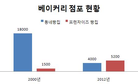 협회에 따르면 동네빵집은 지난 2000년 1만8천여개에서 지난 달 4천여 개로 급감한 반면 대형 프랜차이즈 점포는 1천500여 개에서 5천200여개로 늘었다.