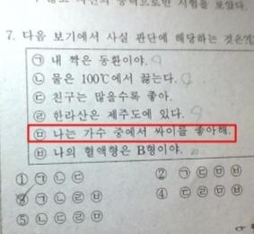 '다음 보기에서 사실 판단에 해당하는 것은?'이라는 질문의 보기에 '나는 가수 중에서 싸이를 좋아해'라는 문장이 있었다.