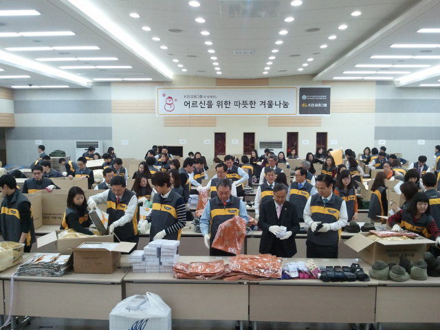 이날 행사에는 어윤대 KB금융그룹 회장, 임영록 KB금융지주 사장, 민병덕 KB국민은행장 및 계열사 사장단 등 임직원 150여명과 한국사회복지관협회 배윤규 회장 및 KB금융그룹 광고모델인 이승기가 참석해 이불, 목도리, 털모자, 장갑 등 어르신들의 추위를 막아줄 10여종의 생활용품으로 구성된 방한용품세트를 직접 포장했다.