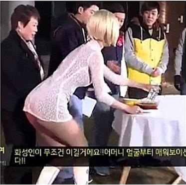 특히 한송이가 허리를 숙이자 짧은 스커트 뒤로 엉덩이 라인이 그대로 그러나 눈길을 끌었다.
