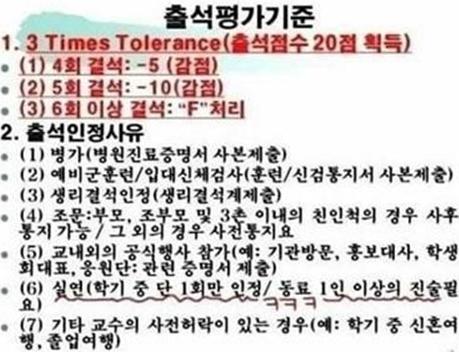이 교수님의 출석 평가 기준에 따르면 출석인정사유에는 "'실연' (단 학기 중 1회만 인정), 동료 1인 이상의 진술 필요"라고 적혀 있어 웃음을 준다.