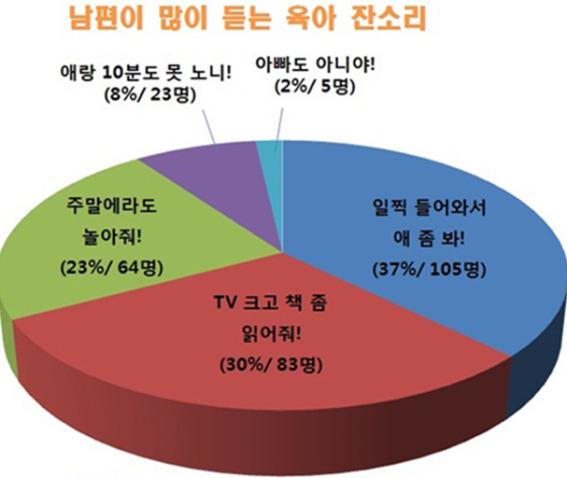 남편이 많이 듣는 잔소리 1위는 37%가 ‘일찍 들어와서 애 좀 봐’인 것으로 조사됐다.