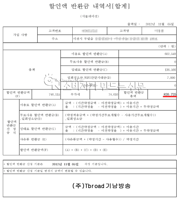 서 씨는 어떤 근거로 위약금이 정산되는지 자료를 요청했고 티브로드 측은 ‘할인액 반환금 내역서’를 제시했다. 위약금으로 청구된 금액은 지금껏 김 씨가 할인받아온 금액에 대한 반환액이라고 기재되어 있었다.