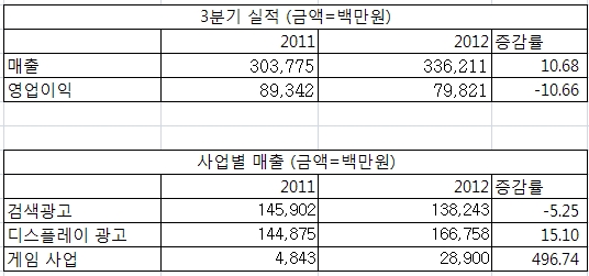 <2011년과 2012년 3분기 다음 커뮤니케이션 매출 추이/2012년 3분기 공시자료>