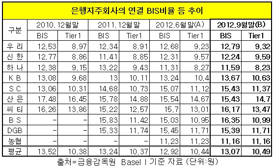 지난 9월 말 현재 모든 은행지주회사가 계량평가기준 1등급(BIS비율 10%, 기본자본비율 7%) 수준을 지속적으로 유지하는 등 자본적정성이 양호한 상태로 풀이된다. 후순위채 발행 등을 통해 추가적으로 자본을 확충하는 등 내년 1월1일부터 도입되는 바젤Ⅲ에 대비하고 있기 때문이다.