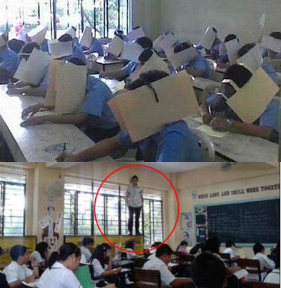 이어 또 다른 한 교실은 학생들이 머리에 종이를 쓰고 있어 옆을 볼 수 없게 했다.