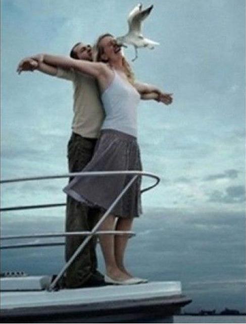 타이타닉 커플의 최후 사진에 누리꾼들은 "코 아프겠다", "어쩌다가", "갈매기가 질투났나보네", "현실은 최악"등의 반응을 보였다. (사진-온라인 커뮤니티)