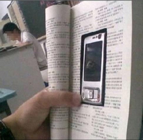 공개된 사진에는 수업시간에 책을 펼쳐놓은 학생의 책 속에는 휴대폰이 들어가 있다.