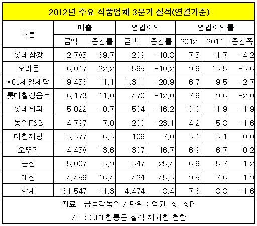 수익성이 가장 크게 악화된 업체는 롯데삼강으로 올해 3분기 영업이익률이 지난해 같은 기간 보다 4.2% 포인트나 떨어진 7.5%를 기록했다.