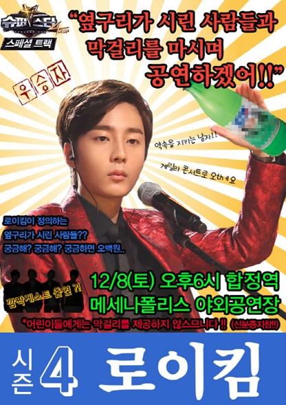 Mnet '슈퍼스터K4'는 7일 공식 트위터에 "우승공약! 실천합니다! [슈퍼스타K4 우승자 로이킴 막걸리 게릴라콘서트] 12/8일(토) 오후6시 합정역 10번출구쪽 메세나폴리스 야외 공연장! 선착순 300명 입장입니다) 막걸리 받기 위해선 신분증 지참 필수!"라는 공지를 게재했다.