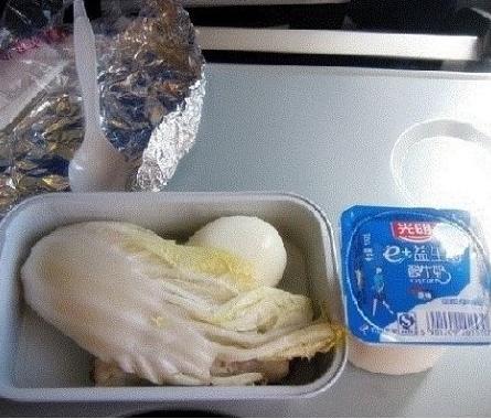 기내식은 생배추 한 잎과 삶은 달걀 하나, 요구르트 하나가 전부여서 보는 이들을 황당하게 만들었다.