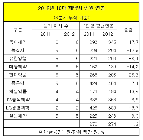 10대 제약사중 유일하게 이익률이 두자릿 수(10%포인트) 급추락한 일동제약도 임원 연봉은 되레 8% 올랐다.