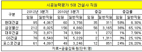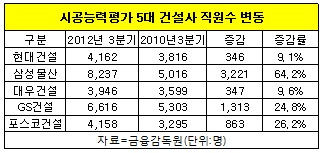 10일 금융감독원에 따르면 2010년 3분기부터 올해 3분기까지 최근 3년간 시공능력평가 상위 5개 건설사 직원수는 2만1천29명에서 2만7천119명으로 4천600여명(26.7%) 늘어났다.