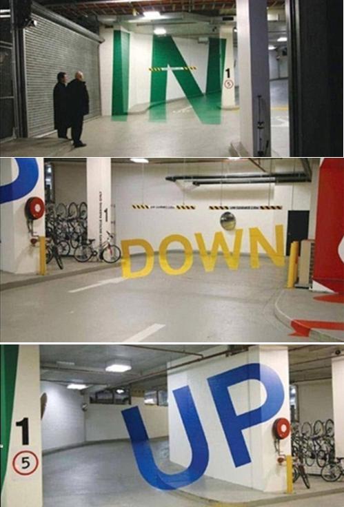 공개된 사진에는 주차장 안에 'IN', 'DOWN', 'UP'이라는 문구를 새겨놓았다.