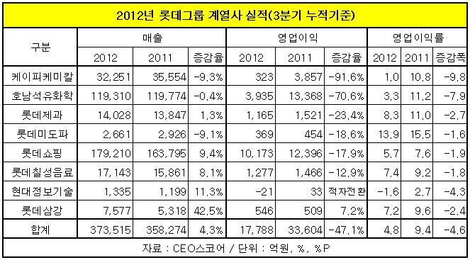롯데삼강을 제외한 7개 계열사의 영업이익이 감소했으며, 특히 8개 상장 계열사 전부가 영업이익률이 하락하는 극도의 부진을 보였다.