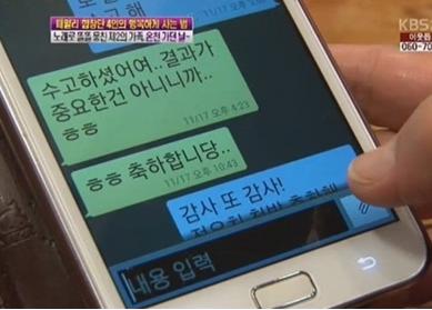 이날 방송에서 차태현의 어머니 최수민 씨는 KBS 2TV '해피선데이-남자의자격' 패밀리 합창단이 부산 국제 합창대회에 도전했을 당시 아들과 주고받은 문자메시지를 공개했다.