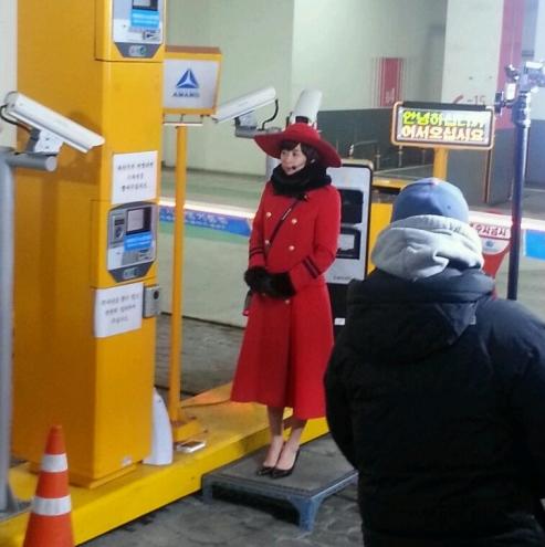 공개된 사진 속 최강희는 한 건물 주차장에서 빨간 코트를 입고 주차 안내원으로 변신했다.