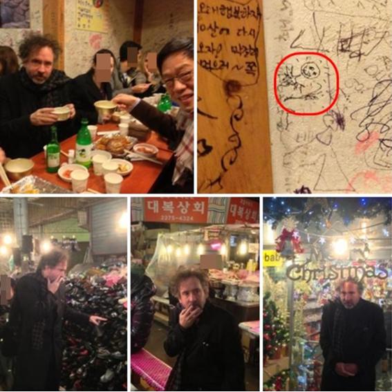 공개된 사진은 팀버튼 감독이 광장시장에서 빈대떡과 막걸리를 먹는 모습을 담고 있다.