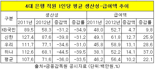 이에 비해 4대 은행 모두 올들어 직원 평균 급여는 대부분 두자릿수로 상승했다.