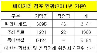 지난해 기준 베이커리 점포는 동네빵집이 5천184개로 가장 많고 파리바게뜨가 3천141개, 뚜레쥬르가 1천303개다. 파리바게뜨와 뚜레쥬르 본사가 직접 운영하는 직영점은 각각 46개와 22개 뿐이며 나머지 점포는 전부 가맹점주들이 운영 중이다.