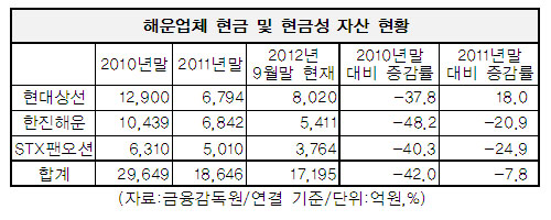 14일 금융감독원에 따르면 국내 3대 해운사인 현대상선과 한진해운, STX팬오션이 보유하고 있는 현금 및 현금성 자산은 지난 9월말 기준 1조7천195억원으로 지난해 말보다 총 1천451억원(-7.8%) 감소했다. 지난 2010년말에 비하면 42%나 감소한 수치다.