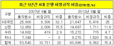 14일 금융감독원 공시자료에 따르면 KB국민은행과 신한은행, 우리은행, 하나은행의 총 직원수는 올 9월 말 기준 6만886명이고 이 가운데 비정규직은 9천362명인 것으로 집계됐다. 총 직원수는 지난 2007년 5만3천540명 보다 28.4% 증가한 반면, 비정규직은 12.8% 감소했다.